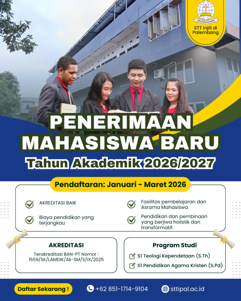 Memasuki Tahun ajaran 2026 , Sekolah Tinggi Teologi Injili di Palembang (STTIP) membuka penerimaan dan seleksi mahasiswa baru gelombang pertama Januari- Maret 2026.